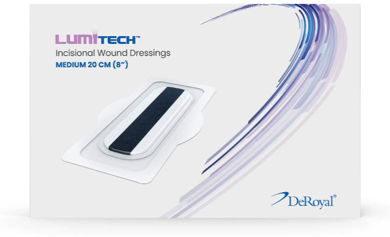 The DeRoyal® Lumitech™ Incisional Wound Dressing is a hydrophilic, absorbent, multi-layer surgical wound dressing. The dressing is composed of an integrated wound contact layer, fluid absorbent woven fibers, pressure-distributive polyurethane foam, and a protective, breathable, water-resistant polyurethane film border incorporating Lumina® Adhesive technology. Lumina® Adhesive technology is a patented UV light “switchable” adhesive film that supports long wear time with the option for a gentle dressing removal using UV light.